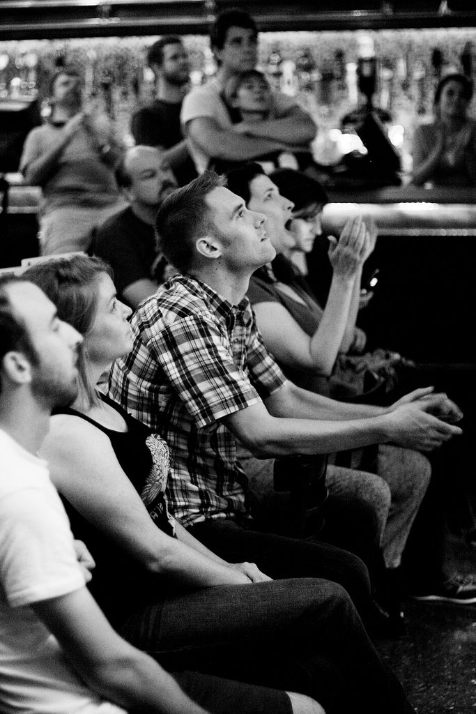 Patrons at the Flying Saucer watch Barack Obama’s nomination acceptance speech. August 28, 2008.
