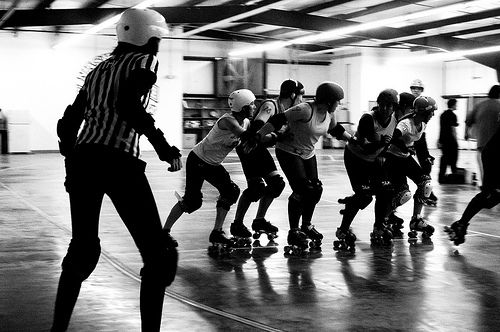 A referee looks on as the Nashville Roller Girls scrimmage with the new rules for the year. January 16, 2013.