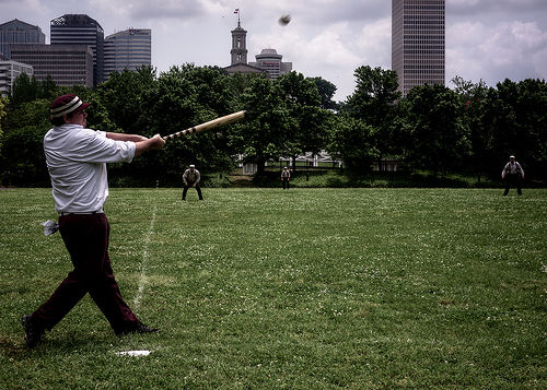 I went out to the bicentennial mall this weekend to catch some vintage (1860s) baseball. I didn’t have a ton of time, but I stayed long enough to grab some photos and learn at least one rule (catching the ball after one bounce is still an out). It was a blast! The next game is June 2 at the Carnton Plantation in Franklin, so head on out there if you want to see it.