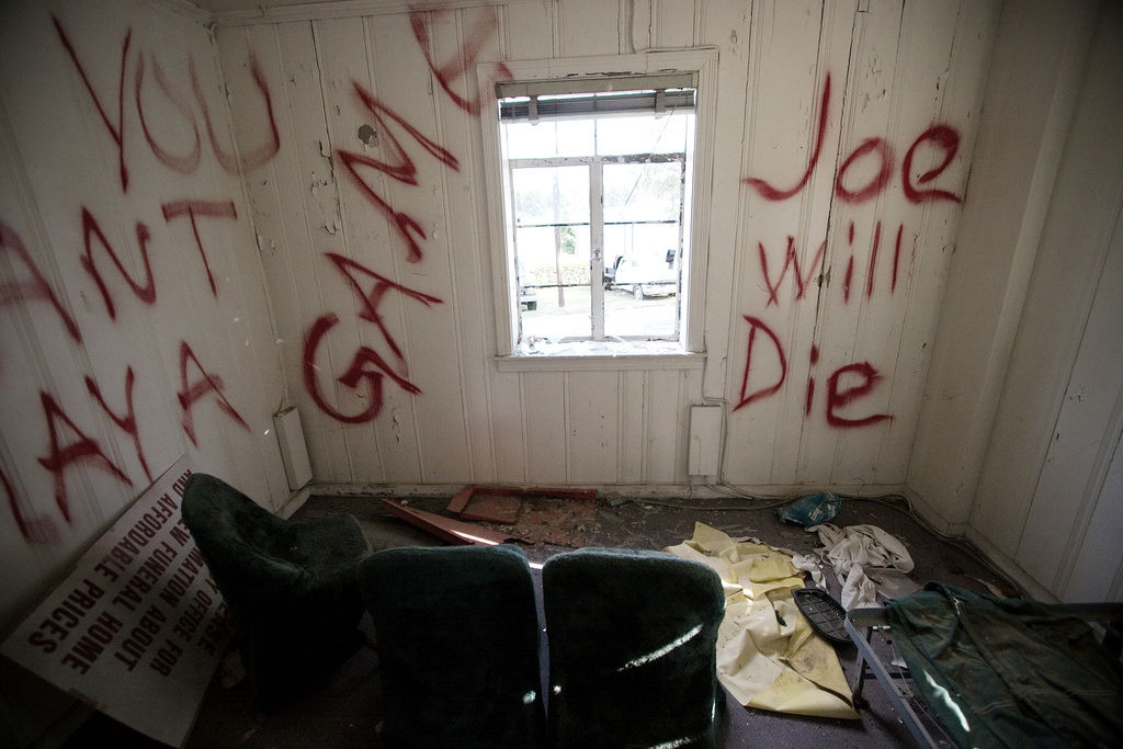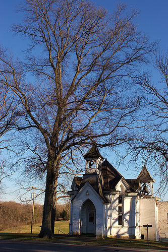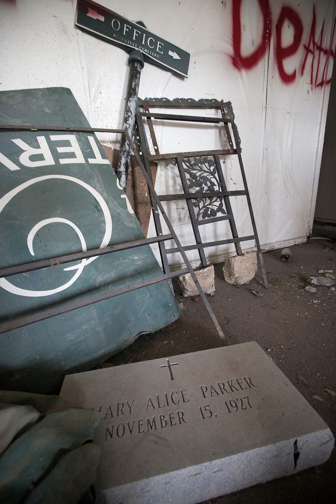 I took this photo of the Mt Olivet chapel 8 years ago to the day.. I am sad to learn that it burned (photo courtesy of Larry McCormack), last night. This is unfortunate, but not surprising, as the Mt Olivet Cemetery has fallen into disrepair over the last few decades — vandals and squatters have moved in and made their mark. Last night’s fire was almost certainly started by bored kids or cold squatters. I have a friend buried at Mt Olivet, so I bum around there quite a bit, and the inside of the chapel looked quite bad even as early as 2008. Betsy has more info over at Pith in the Wind.